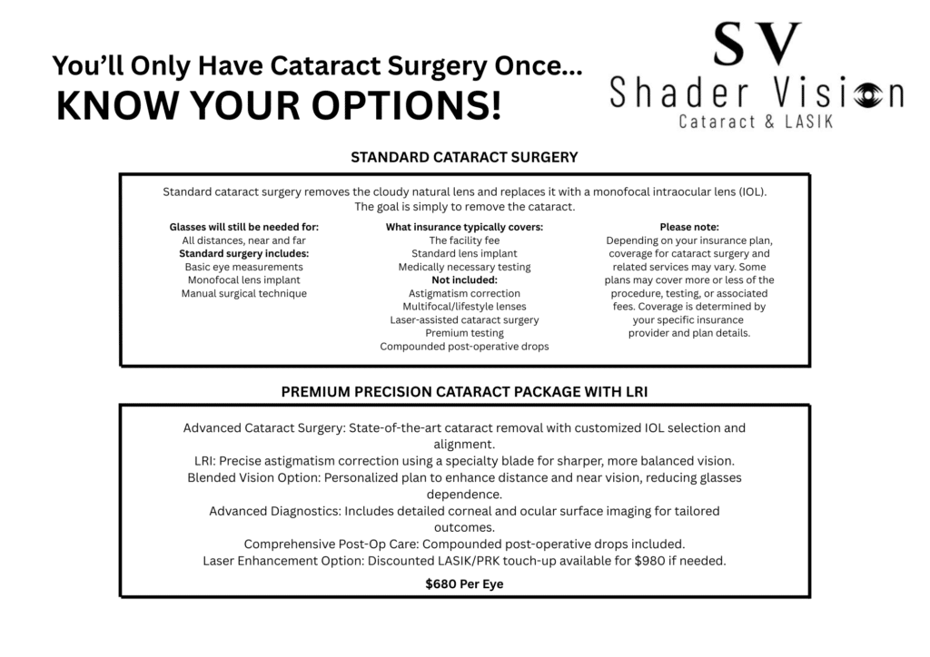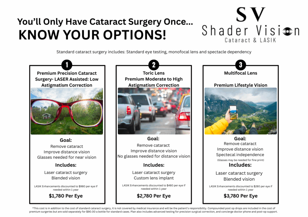 Typically, medical insurance covers only the medically necessary portion of cataract surgery. It will pay for the insertion of a basic lens. Medical insurance typically does not cover advanced lens technology, so the cost to you will depend on your individual plan and your co-pay amount. These cutting edge technologies are used to provide you independence from glasses at the same time you have your lens replaced.If you have astigmatism, this can be corrected with an advanced lens, too! Multifocal lenses, those that allow you to see at all distances and free you from reading glasses, are typically not covered by insurance. A member of the surgery scheduling team at Shader Vision can provide you with the costs of these advanced procedures before scheduling your surgery.